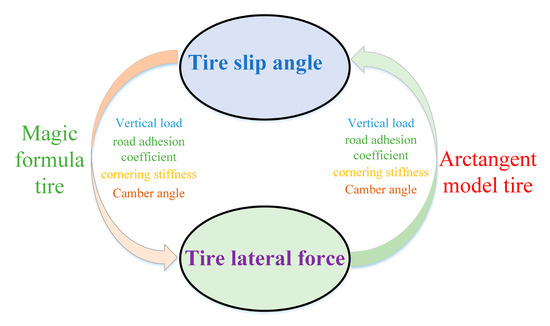 Since the magic formula tire model does not solve the tire slip angle and depends on a large number of fitting data, we used the arctangent model tire to represent the relationship between the lateral force and the tire slip angle. A large number of studies indicated that the tire sideslip characteristics of the two tire models have a high coincidence in the linear region of the tire [31,32,33]. In addition, the tire limit value cannot exceed the adhesion circle in the tire constraint condition. So, the inverse tangent function tire model can meet the accuracy of the tire model in this paper. The logical relationship between the magic formula tire model and the arctangent tire model is shown in Figure 4.