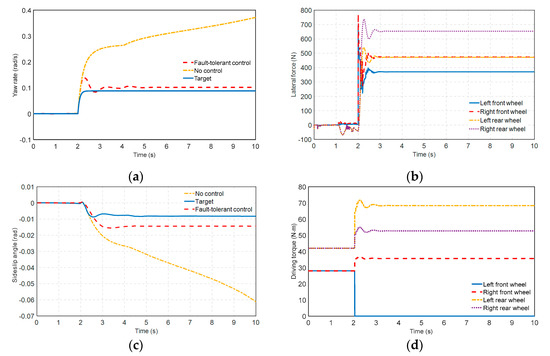 Results of the single-wheel failure in the angular step steering: (a) Yaw rate; (b) Lateral force; (c) Sideslip angle; (d) Drive torque.