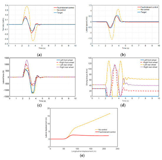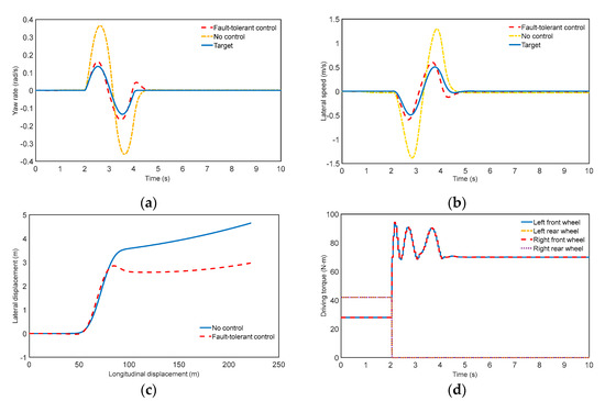 Results analysis: As can be seen in Figure 6a, the steering angle starts to be applied at 2 s, increasing the yaw rate, and the front left wheel actuator fails and then produces transverse disturbance. The uncontrolled vehicle is unstable. The yaw rate and the expected value generated at the time of 4.2 s show a maximum deviation of 0.025 rad/s and then remain constant. Results analysis: In Figure 6b, the lateral force of the tire is 0. At 2 s, a left front wheel begins to fail, along with transverse disturbance and increasing lateral forces; however, stability soon returned under fault-tolerant control. It can be seen in Figure 6c that the vehicles with fault-tolerant control can follow the vehicle’s expected motion state well, while the vehicles without control are in an unstable state. It is summarized that the designed fault-tolerant control strategy has fine tracking ability and can have a control effect. Figure 6d shows a plot of the driving torque, from which the driving torque is optimally distributed, and the front wheel torque is less than the rear wheel torque. At 2 s, the left front wheel driving torque turns to 0. In this case, the remaining three normal driving motors redistribute the driving torque. The figure shows that the torque increases, and the left rear wheel drive torque is the largest to render the body stable again by the resulting torque. In summary, this explains that the designed fault-tolerant control strategy can significantly improve the vehicle’s power and stability.