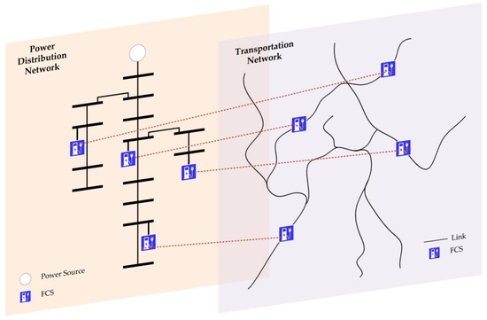 TN and PDN are connected by FCS as shown in Figure 1. The FCS is designed as the connection of two networks. The power demand in the FCS connects the vehicle flow and the power flow. The vehicle flow into the FCS causes a variation in power demand which influences the power flow in the PDN.