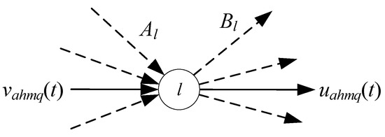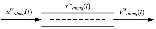 Equation (7) describes other nodes l besides the O–D pair rs. At a common node l over a path q, there is not an instantaneous departing flow or an instantaneous arriving flow . The sum of the exit flow rate is equal to the sum of the inflow rate at any time t.