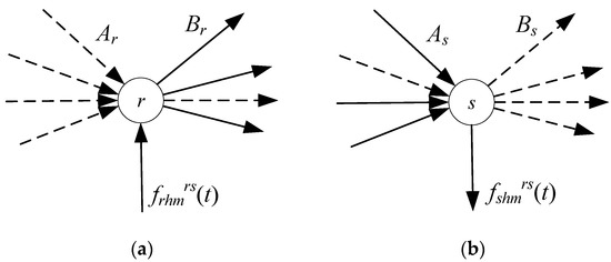 In Figure 3a, the dashed line denotes the link connecting to origin r but does not belong to the path set of vehicle m in task h with O–D pair rs. The vehicles are assigned only to the links denoted by the full lines. ∀ a ∉ q is the dashed denoted link, = 0, = 0, and = 0. In another word, the dash line denoted links are unavailable to some assignments of specific vehicles m in task h with O–D pair rs. However, these links are connected to the node and it is possible for them to be available to assignments of other vehicle types, other tasks or other O–D pairs.