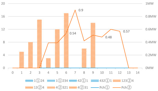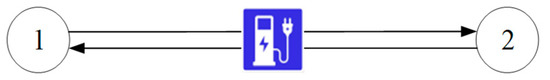 Table 2 and Figure 5 provide data for an example travel scenario. Suppose there is a task from node 1 to node 2. Six of the same type of EVs are travelling and all require charging at the FCS. The travel time from node 1 to the FCS and the time from the FCS to node 2 are equal to 2 h. The charging time of the 6 EVs is 3. For time period 0 to 7, the 6 EVs can finish the travel period. = 1 and = 3. The 6 vehicles are assigned to times 0, 1, and 2 corresponding to 1, 2, and 3 vehicles to depart.