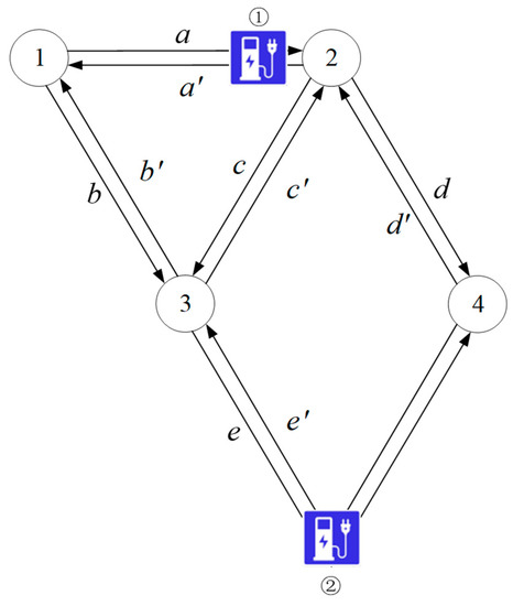 Figure 6 gives the TN of the case. There are 4 nodes, 10 links, and 2 FCSs in the TN. A total of 1 h is taken as a time interval. The travel cost ca[xa(t)] is the time cost. Table 3 provides the parameters of this TN case.