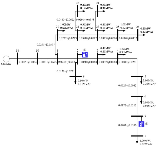 Figure 7 provides the PDN of the case. This case is adopted from [42] and the 2 constant loads in bus 2 and bus 7 are substituted with 2 FCSs. There is not a real or reactive ramp constraint on the power source in bus 51. This is a radial PDN. Its network structure is in accordance with most common PDNs. In the same power transmission direction, a greater power loss would be caused if the load was farther from the bus because the power source would need to flow over more branches in order to reach the load and, therefore, each branch would experience some power loss.