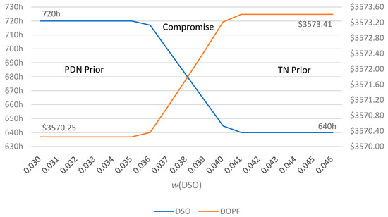 Finally, this problem is solved by multi-objective optimization. Equation (31) is the multi-objective function. w(DSO) and w(DOPF) are two weights of two objective functions.