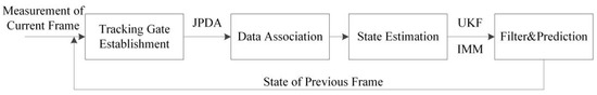 The accuracy of data association and association calculation still have room for further improvement. The real-time and accurate estimation and update of different motion states of obstacles need to be further improved. Therefore, as shown in Figure 1, an improved JPDA is proposed to introduce more parametric features of the obstacles to further filter the valid measurements and reduce the computational effort of the algorithm. The interacting multiple model (IMM) is designed to deal with the tracking problem of different motion models of obstacles. The unscented Kalman filter (UKF) is designed to update the motion state of the obstacles.