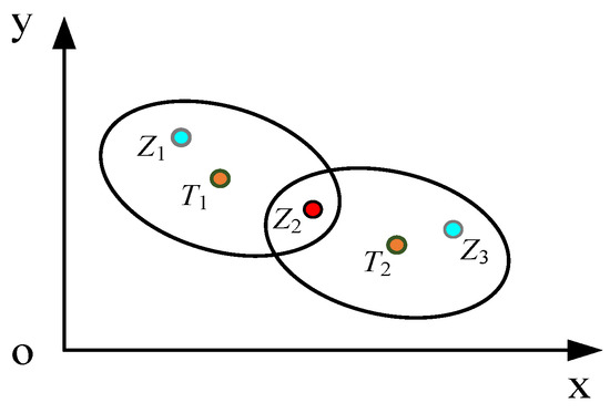 T1 and T2 are two tracking targets that still have three measurement values of Z1, Z2 and Z3 after tracking gate processing. There are two effective measurement values of Z1 and Z2 in the T1 target tracking gate, and there are two effective measurement values of Z2 and Z3 in the T2 target tracking gate. The measurement value of Z2 exists in the intersection area of the two target tracking gates. A target has only one real measurement value corresponding to it, so the joint probabilistic data-association algorithm is used to calculate the matching probability between the target and the effective measurement value. This algorithm is suitable for multi-objective data association in dense scenes. The joint probability needs to be calculated to determine which target the Z2 measurement value belongs to.