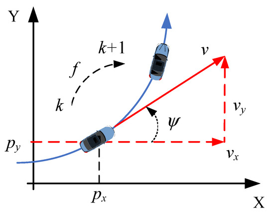 In the above equation, px, py is the position of the vehicle, v is the velocity of the vehicle, ψ is the angle and is the angular velocity. The state vector at moment k is known and predicting the state vector at moment k + 1 requires the derivation of the state vector, with the help of Equation (41), and the rate of change of the state vector solved.
