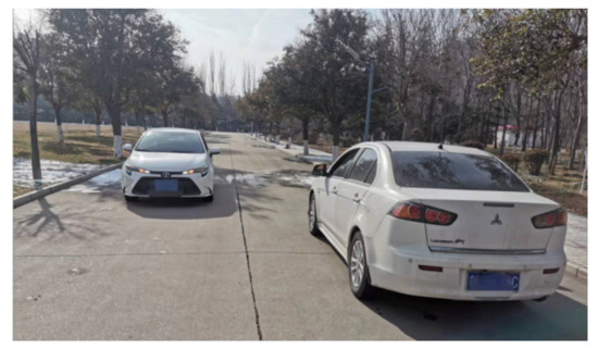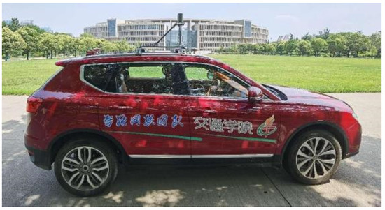 The experimental platform used in this paper as shown in Figure 6 is an intelligent vehicle modified based on Haval H7. A Velodyne 32-line laser radar was installed on the roof through a tripod, a Delphi millimeter wave radar was installed on the front of the bumper, a Mobileye camera was installed on the front windshield of the car, and a set of GNSS integrated navigation systems were deployed. Sensors were used to detect the surrounding environment and locate the ego vehicle, and provide the velocity, distance and movement status information of the obstacles. An industrial personal computer was installed. Its processor was Inter Core i7-8700 with a main frequency of 3.2 GHz. The GPU version was Nvidia Tesla T4, the memory was 32 GB, the hard disk was SAMSUNG 500 G, and it was also equipped with a CAN bus communication card. The ellipse tracking threshold was set to 3, and the measurement noise R was set to 0.02.