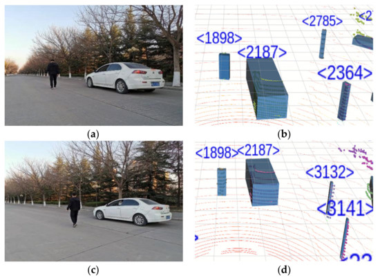 In this experiment, a pedestrian and a vehicle travelling in the same direction were selected as the association targets to judge the accuracy of the association algorithm at different moments. As shown in Figure 7, a graph of the association effect at different moments is given. In addition, the algorithm automatically numbered the detected obstacles. The test results show that at frame 70, the vehicle ID number 2187 and the pedestrian ID number 1898 were detected, in addition to the trees on both sides of the road that were accurately detected with ID numbers 2785 and 2364, respectively. The vehicle and pedestrian moved slowly forward and by frame 100, the point cloud data had clearly moved some distance forward, and the trees with ID numbers 2785 and 2364 were out of association. The trees with ID numbers 2785 and 2364 were out of range and were not associated, but the vehicles and pedestrians were correctly associated, and the ID numbers did not change. By frame 130 of the point cloud data, the obstacle was still successfully associated with no change in ID number, the trees out of detection range were not associated and the new trees detected were numbered. In summary, the designed data-association algorithm can effectively complete the data association of obstacles at different moments, and no obstacles were lost or incorrectly associated. At the same time, the average running time of the improved data-association algorithm in this paper was 51.63 ms per frame, which meets the real-time requirements of the intelligent vehicle.