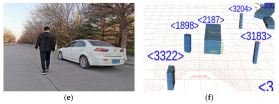 Obstacle data-association results. (a) Original scene view at frame 70, (b) frame 70 point cloud data, (c) original scene view of frame 100, (d) frame 100 point cloud data, (e) original scene view of frame 130, (f) frame 130 point cloud data.