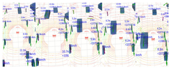 As shown in Figure 8, this experiment selected two vehicles moving in opposite directions detected by the intelligent vehicle during the driving process as the obstacle state update scenario. Figure 9 gives a partial update process of the obstacle state using the unscented Kalman filter. The algorithm accurately marked the position, velocity magnitude, ID number and direction of movement of the obstacle, where the green arrow represents the direction of the obstacle movement. At first, only one vehicle travelling in the same direction was tracked, ID number 1108, indicated by purple arrow number ①. Positioned at 12.4 m from the experimental vehicle with a velocity of 1.5 km/h, the road was lined with stationary trees. Then, the vehicle travelling in the same direction was tracked, ID number 1449, and the obstacle is indicated by purple arrow number ②, positioned at 11.1 m from the experimental vehicle with a velocity of 9.4 km/h. When driving continued, the two vehicles were tracked continuously and steadily, and if the green arrow deviated to the right, it meant that the vehicles had a tendency to move to the right. In summary, the designed target tracking algorithm can effectively and efficiently update obstacle status.