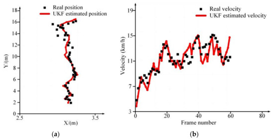 The position and velocity information of the vehicle travelling in the opposite direction to the experimental vehicle was extracted from the algorithm and compared with the real position and velocity information, and the results are shown in Figure 10. Through the position test comparison results, it can be determined that the obstacle draws nearer to the experimental vehicle, in line with the actual movement, and that the trajectory is smoother and the tracking is stable. The maximum error in position estimation was 3.14%. Through the results of the velocity test comparison, it can be determined that the test vehicle tracked consistently for 8 s with a minimum velocity of 4 km/h and a maximum velocity of 14.6 km/h. The tracking was stable. The maximum error in velocity estimation was 1.52%. In summary, the designed unscented Kalman kilter and IMM-based model is able to achieve accurate estimation and update of obstacle position and velocity.