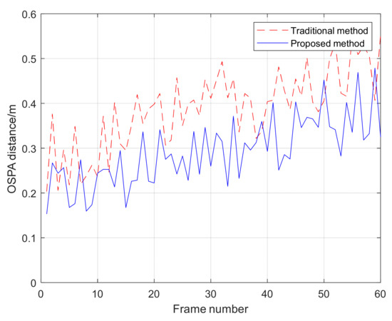 The average OSPA distance of the traditional method is 0.3880 m, and the average OSPA distance of the proposed method is 0.2925 m. Therefore, the proposed method is more effective than the traditional method.