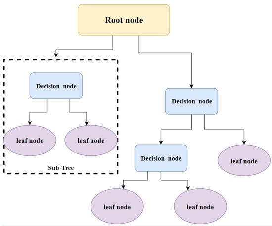 One of the earliest and most well-known ML algorithms is the DT. DT is an ML algorithm that divides learning activities. The tree is constructed by dividing the dataset into smaller sets until each partition is clean and pure. In a typical DT, each node will exist on multiple levels, and the node at the very top of the tree, known as the root node, will be the first level. Every internal node is a test on one of the input variables or attributes. Depending on the test result, the classification algorithm takes a branch to the right or left to reach the appropriate child node. The testing and branching processes are repeated until it reaches the leaf node. The leaf nodes, also known as terminal nodes, correspond to the decisions made [38,39]. This structure of the DT algorithm is illustrated in Figure 1.