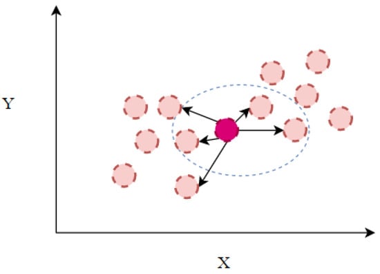 For classification issues, the algorithm assigns a class label based on the majority vote (i.e., the label that appears more frequently in neighbors). The accuracy of the findings is determined by comparing the model’s predictions and estimations to the available classes in the testing set [39,41]. Figure 2 illustrates the KNN algorithm where the arrows point to the K nearest nodes to the target node.