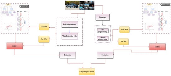 In this section, we start by discussing the methodology of the proposed approach. Figure 4 illustrates the steps of the proposed approach methodology. The Udacity and BDD100K datasets are collected from Roboflow and Kaggle repositories. Data preprocessing techniques are applied to handle the missing values in the datasets. In addition, the datasets are split into 80% training data and 20% testing data. The most popular ML mechanisms, such as the DT, NB, KNN, SGD, MLP, and LR algorithms, are used to classify the objects for the Udacity and BDD100K datasets. Finally, the five main evaluation measures for evaluating a classification model are Accuracy, Precision, F1-Score, G-Mean, and Recall. In the second stage, we divided the BDD100K dataset into groups, and the steps mentioned above were re-applied to these groups to obtain a new model compared to the model produced from the first stage.