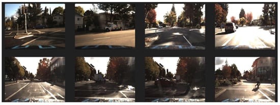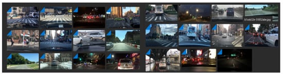 On the other hand, the BDD100K dataset is one of the most commonly used datasets for object detection and classification in autonomous driving. The diversity of the data is essential to test the robustness of perception algorithms. This dataset includes a wide range of scene types, including city streets, residential areas, and highways. In addition, the videos were taken in a wide range of climatic conditions and at various times throughout the day. In this dataset, there are up to 90 objects per image [29]. The BDD100K dataset contains 13 classes (i.e., traffic sign, traffic light, pedestrian, rider, car, bus, truck, train, motorcycle, bicycle, vehicle, another person, and trailer). General snapshots consisting of several selected images taken from the Udacity and BDD100K datasets are shown in Figure 5 and Figure 6, respectively.