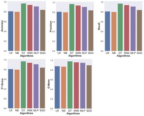 In this section, we first present the tested experiments on the investigated datasets. Then, we discuss and analyze the obtained results. Five main evaluation measures have been used in these experiments: Accuracy, Precision, F1-Score, G-Mean, and Recall. The accuracy of a classifier is measured as the proportion of the total number of correct predictions. Precision measures the number of instances accurately recognized as positive relative to all the optimistic predictions, whereas Recall measures them relative to all the positive instances. Moreover, F1-Score is a weighted average of Precision and Recall. Finally, G-Mean evaluates classification results on both the majority and minority classes equally. Even if the negative instances are classified correctly, a low G-Mean indicates poor performance in classifying the positive cases [49]. G-Mean maximizes each class’s accuracy while keeping this accuracy balanced [50]. These measures range from 0 to 1, where 1 means the highest score. These measures are used to evaluate and compare the performance of six main classification algorithms. The DT, NB, KNN, SGD, MLP, and algorithms are considered in this experimental study.