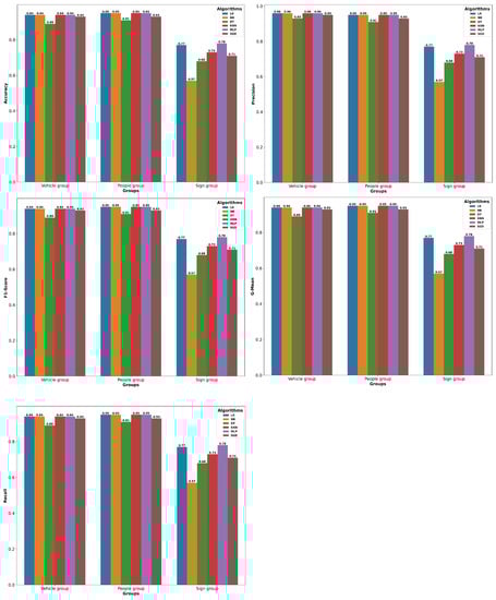 Figure 9 illustrates score measures: Accuracy, Precision, F1-Score, G-Mean, and Recall of the tested algorithms for the obtained groups based on the nature (i.e., vehicles, people, and signs) from the BDD100K dataset. It is observed from the figure that the vehicle group gets the highest score in all measures. The results of the signs group were the worst among them.