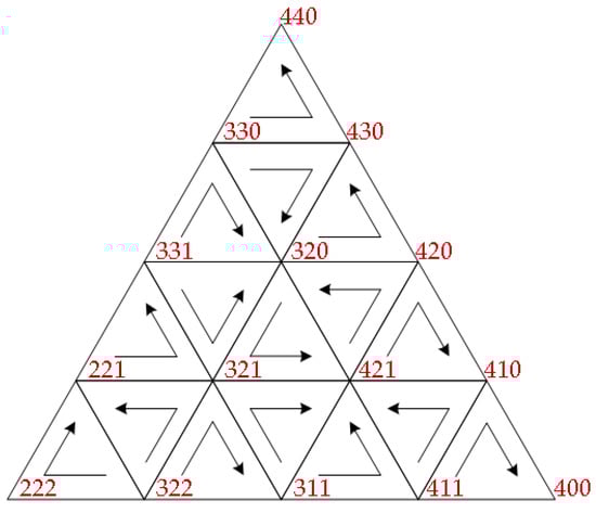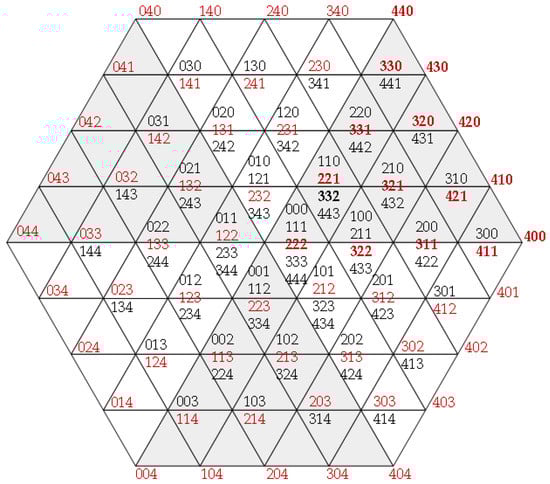 The reference vector is normalized so that its standardized value is within the positive hexagon formed by the space vector, and the coordinates of the fundamental vector in the g-h coordinate system are integers. Therefore, the coordinates (Vα, Vβ) transformed by Equation (12) are normalized. The vector of the longest edge in the regular hexagon of SVPWM in the a-b-c coordinate system is (1, −0.5, −0.5), and the modulus of this vector, |Vmax|(abc) is 1.5. The coordinates of this vector in the g-h coordinate system are (3/2,0), and the modulus of this vector in the g-h coordinate system, |Vmax|(g-h) is 3/2. Since the hexagonal vector with five levels has four layers, so that the maximum coordinate is 4, the scalar transformation Equation (14) is obtained in order to make the maximum vector lengths equal in the a-b-c and g-h coordinate systems: