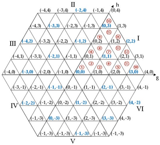 Figure 5 shows the coordinates of the five-level SVPWM in the g-h coordinate system. The sector division is shown in the figure; the vector hexagon is divided into six large sectors, and each large sector contains sixteen small sectors. Other large sector coordinates are converted to sector Ⅰ in order to facilitate the operation, and the coordinate conversion equation is shown in Equation (15):