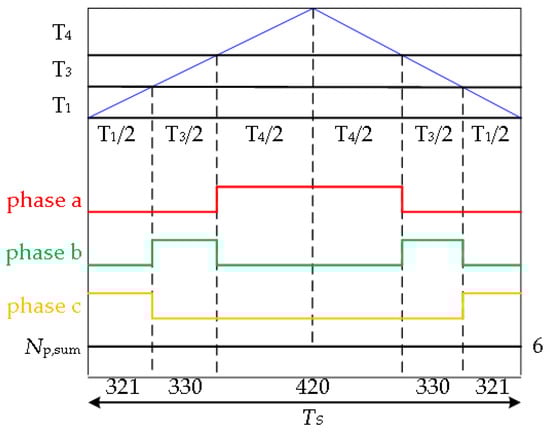 where Vx, Vy, and Vz are the synthesis vectors corresponding to the small sectors, and Tx, Ty, and Tz are the action times of each vector. In order to reduce the switching frequency of SVPWM, a five-segment allocation of the synthesis vector’s action time in each control period Ts is adopted. The number of input SMs should be changed only in one phase when the input state is switched. The order of the synthesis vector action in sector I is shown in Figure 6.