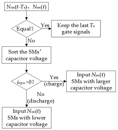 The MMC obtains the number of input-SMs Nonp,nx for each bridge arm of the three phases through SVPWM modulation of two bridge arms. The different input times of the SMs cause imbalances in charging and discharging. It is necessary to adopt the appropriate capacitance voltage balancing algorithm so that the SM’s capacitance voltage is kept near the rated value of Vdc/4 during the operation of the MMC. Currently, the two most widely used balancing algorithms are the closed-loop capacitor voltage balancing algorithm based on PWM and the capacitor voltage sorting balancing algorithm. Because the sorting algorithm has easy implementation, good flexibility, and adaptability in the modulation strategy, it is adopted in this paper as the capacitor voltage balancing algorithm. At every control period Ts, the capacitance voltage values of each sub-module are sampled and sorted. First, if the bridge arm current direction is positive, the SM with the lower capacitance voltage is selected in sequence and put into priority to charge it and increase the capacitance voltage value. Second, if the bridge arm current direction is opposite, the SM with the larger capacitance voltage is selected in sequence and put into priority to discharge it and decrease the capacitance voltage value. The sorting algorithm is shown in Figure 9. To reduce the times of switches, if the number of input-SMs at sampling period Ts is identical to the last sampling period, the state of input-SMs from the previous control period is maintained.