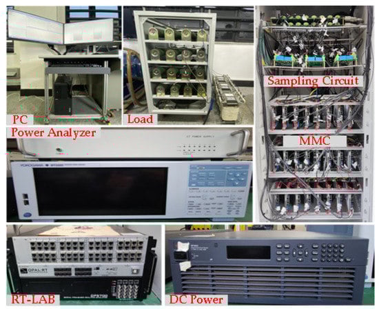The experimental system is shown in Figure 10. The OP5700 rapid prototyping system of OPAL-RT® is used as the control circuit, and the PEH2015 of Imperix® Switzerland is used as the SM to construct a five-level MMC experimental system so as to verify the effectiveness and feasibility of the 0CMV-SVPWM proposed in this paper. Table 5 shows the experimental parameters. In this paper, the modulation index is defined as the ratio of the three-phase synthesis vector to the maximum value of the vector hexagon (3Vdc/2). The modulation index is set to 0.3~0.85 for the following reasons. On the one hand, when the modulation index is less than 0.5, the N = 4 MMC output has only three levels, with 0 and ±Vdc/4 for each phase, which is a three-level output state. In order to better analyze the output characteristics and CMV over a wide range of modulation indices in the experimental verification, experimental data were recorded every 0.5 modulation index from m = 0.3 to 0.85. On the other hand, for the conventional SVPWM strategy, the modulation index m < 0.866 is the linear modulation region. When the modulation index is higher than the value, it is in the over-modulation region, and the quality of the output waveform will be degraded because the complete voltage vector circle cannot be synthesized. Therefore, the maximum value of the modulation index is set to 0.85 in the experiment.