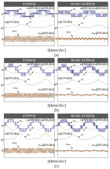 Figure 11 shows the experimental waveforms of phase voltage va, phase current ia, SM capacitance voltage vc, and CMV of under the conventional SVPWM and 0CMV-SVPWM with the modulation system m = 0.4, 0.6, and 0.8, respectively.