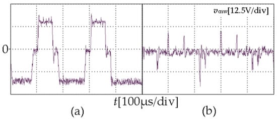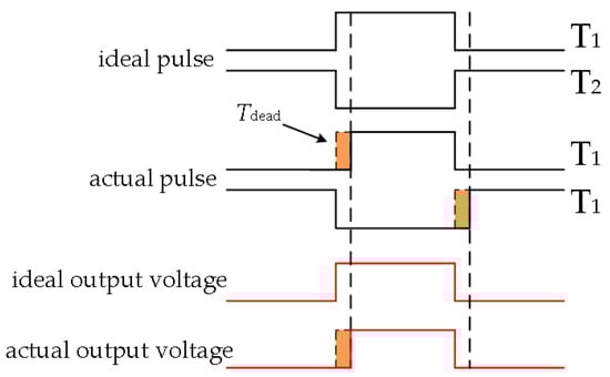 As shown in Figure 11, the amplitudes of CMV measured by the traditional SVPWM at m = 0.4, 0.6, and 0.8 are 16.95 V, 17.63 V, and 17.95 V, respectively, which are slightly larger than the 16.67 V calculated by Equation (9). It is mainly caused by the fluctuation of the SMs’ capacitance voltage, which is superimposed on CMV. With the 0CMV-SVPWM strategy, the fluctuation of CMV is significantly reduced, but there is still a certain frequency of spike voltage. Figure 12 shows a local CMV magnification of the traditional SVPWM and the 0CMV-SVPWM, and it can be observed that the duration of the spike voltage is much lower than the duration of the CMV of the traditional SVPWM, which is about 4 μs. This is due to the dead time Tdead set for the experimental system to prevent the two IGBTs of the SM from operating at the same time. The dead time is shown in Figure 13 for delayed turn-on and normal turn-off. In essence, the dead time increases by 4 μs of blocking state duration, causing failure to strictly satisfy MMC operating conditions, and it is an inevitable hardware problem. In order to better compare the effect of dead time on the experimental system, as shown in Figure 14, the waveforms of the CMV for the modulation index m = 0.4, 0.6, and 0.8, are shown where the dead time of the system is ignored and the simulation parameters are identical to the experimental parameters. As can be seen from the figure, the CMV is significantly reduced by about 90% with 0CMV-SVPWM, without generating CMV spikes. Therefore, under the ideal condition without considering the dead time, 0CMV-SVPWM can suppress the CMV of MMC to basically zero. If the CMV spike voltage is ignored in the experiment, the CMV amplitudes of 0CMV-SVPWM are approximately 2.95 V, 3.24 V, and 3.46 V, respectively. Compared with traditional SVPWM, it reduces about 82%, so the CMV suppression strategy is effective.