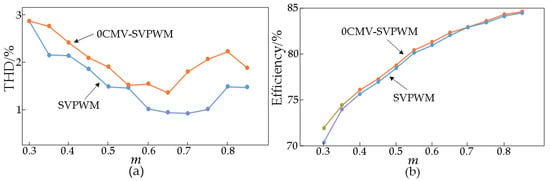 Figure 15a shows the output current THD for the regulating system, m = 0.3–0.85. The output current quality of the conventional SVPWM is slightly better than that of the 0CMV-SVPWM. The vector synthesis is carried out by selecting only 19 vectors that do not generate CMV, as shown in Figure 7, and the size of the small sector becomes larger compared to the conventional SVPWM. Consequently, it has a certain impact on the output waveform quality. The system output efficiency is analyzed with the power analyzer, as shown in Figure 15b. Since two phases of the 0CMV-SVPWM change every time the input state is switched, it causes an increase in the number of switches, making the efficiency of the output lower than that of the traditional SVPWM. However, it shortens the charging and discharging times of SM’s capacitors, and the capacitance voltage fluctuation of 0CMV-SVPWM is reduced compared to traditional SVPWM. The capacitor voltage fluctuation decreases from 9.18 to 7.41% for m = 0.8, a reduction of approximately 1.77%.