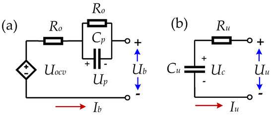 (a) Thevenin model of the lithium-ion battery. (b) Standard RC model of the ultracapacitor.