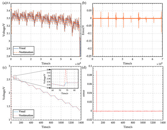 Model verification results. (a) Voltage prediction results of the lithium-ion battery. (b) Voltage prediction error of the battery model. (c) Voltage prediction results of the ultracapacitor. (d) Voltage prediction error of the ultracapacitor.