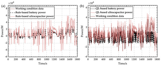 Figure 6a,b show the power allocation based on the rule strategy and reinforcement learning, respectively. Under WLTP conditions, the power allocation of the two strategies can fully meet the power demand by the battery when the power demand is low and meet the demand by the battery output power with a small amount when the power demand is high. Compared with the traditional pure battery drive, both strategies greatly save battery energy.