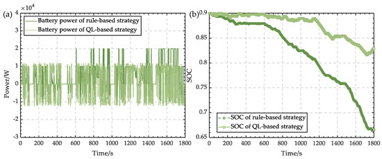 (a) Comparison of the output power between the rule- and QL-based strategies. (b) Comparison of the SOC trajectory between the rule- and QL-based strategies.