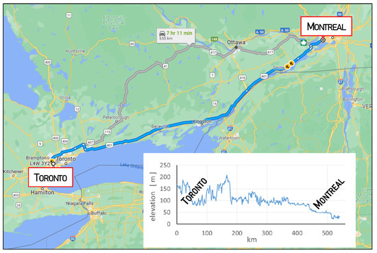 The route between Toronto and Montreal in Canada is one of the busiest highways in North America. A total of about 8000 trucks use it in either direction on a daily basis. Local depots of a shipping company in both cities were selected as the end points of the daily two-way duty cycle of 1081 km, of which 99% is on highways. Speed limits and elevations at 500 m intervals along the route were obtained from Google Earth [8], and outdoor conditions along this route were given by hourly temperature data published by Environment Canada [9] for the year 2020. On the highway, the truck speed was set as 100 km/h. Figure 1 is a map of the route driven, along with an accompanying elevation profile in the inset.
