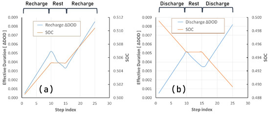 The first case (a) in Figure 2 shows the effective duration of a recharge operation in terms of the absolute value of the degree of discharge (DOD), along with rest phase relaxation rates applied according to details given in [13]. On the horizontal axis, the step index is simply a time step count.