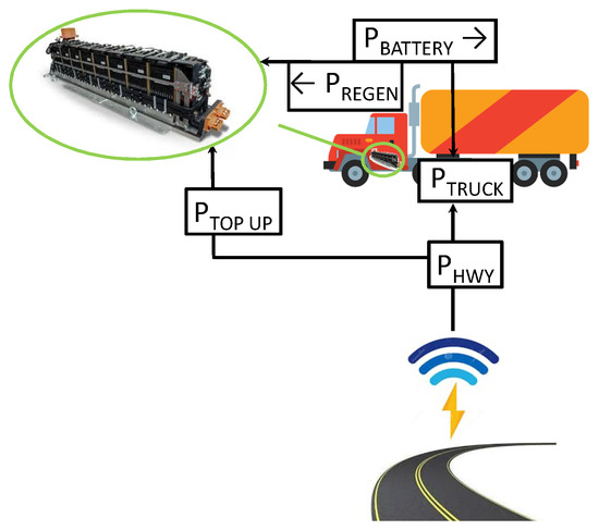 Power flow configuration in electric truck used in simulations. Inset in green oval is the truck battery pack.