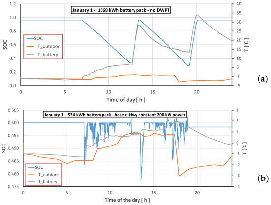 Plots tracking ambient temperature, battery pack temperature and battery SOC over a 24-hour period on January 1. Plot (a) shows output from a simulation with a 16-bank pack and no DWPT. Plot (b) show simulation output for a truck with an 8-bank pack, and full e-Hwy coverage with 200 kW DWPT power provision.