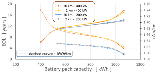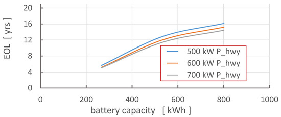 A series of simulations were run with high e-Hwy power levels to see if this could allow small battery pack sizes to complete driving duties on an intermittent e-Hwy with 20 km intervals of electrified and unpowered roadway. Figure 10 plots EOL values versus batter pack capacity for three levels of e-Hwy power provision. Larger battery sizes lead to larger EOL values through mitigation of high current values, whereas elevated levels shorten battery lifetimes through exposure to excessive current rates. These observations echo the findings discussed for Figure 9.