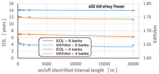 It can be seen in Table 1 that the roughly 8.5 year lifetime determined for the reference case of BETs using megawatt charging, moved to values greater than 15 years for BETs using electrified highways, even for the 4 bank pack, and increased to over 20 years for the 8 bank pack. This value is approaching the calendar life of the battery pack determined as 26.7 years under the same climatic conditions. In general, long-haul trucks are known to typically last 7–8 years (specifically, 900,000 km or up to 17 years with light use) in Canada [20], so the results here show that the battery packs in the BETs simulated on the e-Hwy will normally not need replacement during the vehicle life. In terms of energy efficiency, a slight benefit can be seen for larger pack sizes in Table 1. The table also reports equivalent cycles alongside the EOL values. An equivalent cycle is defined as the battery discharging the amount of energy considered to be the equivalent of the DOD range of its rated capacity. The ratio of equivalent cycles to EOL value is an indication of how hard the battery is worked over its life. From this point of view, non-intermittent e-Hwys seem to put the least stress on the battery packs.