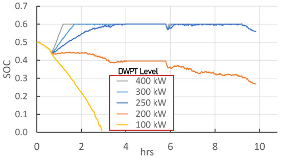 A few observations from Figure 9 merit some mention. For levels of 250 kW or higher, it can be seen that the e-Hwy power provision is more than enough to power the truck and that the SOC can reach a control set point. It simply takes longer at 250 kW compared to higher levels to regain the set point. At a level of 200 kW, the truck is able to complete the day’s driving but does so by depleting battery capacity. Such practice would not be sustainable day after day without off-highway recharging. Finally, for a level of 100 kW, the truck power demand is constantly more than what the highway supplies and the SOC drops steadily to depletion well before the 750 km trip is completed. Highway power levels much beyond what the truck would require in general would require extra levels of control to avoid large recharge currents which would contribute to more rapid battery degradation.