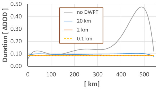 Smoothed DOD curves for the reference no DWPT case and 20 km, 2 km and 0.10 km e-Hwy on/off intervals.