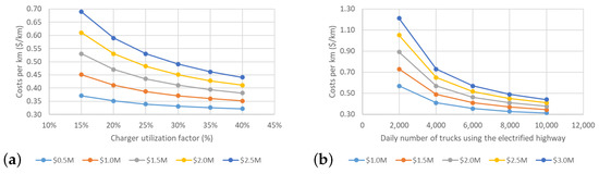Costs per kilometer for the reference case of fast charging at a one megawatt power level for scenarios of different charger cost and charger utilization with a 16-bank truck battery (a) and for the 100% electrified highway for different levels of investment costs per km and highway utilization with a 4-bank truck battery (b).