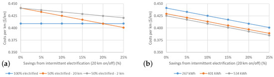 (a) Costs per kilometer driven for different electrification scenarios using a 267 kWh battery. (b) Costs for trucks with different battery sizes for intermittent electrification (20 km on/off), showing different levels of cost reduction from intermittent electrification with investment costs of $2.0 million/km and highway usage at 8000 trucks per day.