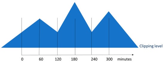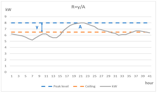 Here, T is the required peak shaving duration, y is the power curtailment requirement and cp is a coefficient that determines the acuteness (shape) of the curve. The acuteness can easily be calculated by analyzing the time series for energy demand. In its simplest form, with a one-hour resolution, the peak will form a triangle and cp = 0.5. When a train of peaks follow each other in a time series, we obtain a ridge that looks like the example shown in Figure 4. Such a ridge would approximate part of the time series for the aggregated load to be controlled. The base line would represent the maximum peak level than can be allowed. The shaved-off ridge is characterized by an area that determines the necessary energy requirement for curtailment, while the maximum peak determines the maximum power needed to counteract the peak.