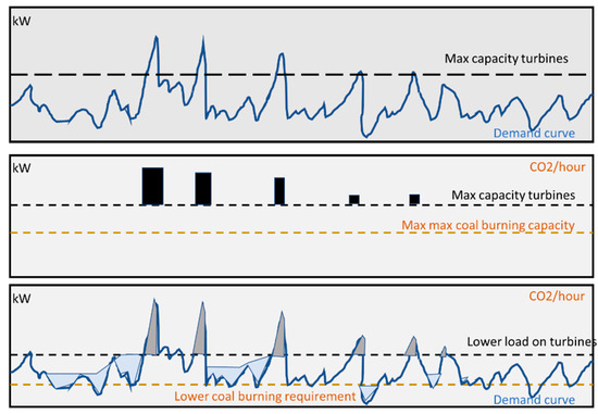 The impact of energy flexibility on CO2 emissions. Upper: A load curve showing peaks that extend beyond the capacity of the existing turbines at plant. Middle: Corresponding chart showing the need for generator set activation to cater for the consumption peak. The plant is burning coal at maximum rate to support maximum electricity generation for turbines. Bottom: Energy flexibility caters for peak shaving and valley filling. Turbines do not need to cover for the highest peaks and the resulting coal-burning load can be reduced.