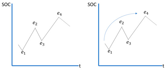 In practice, consecutive charge-discharge cycles of various sizes can be treated so that local extrema within a sequence such as and in Figure 5 are ignored and the and define the Once this is established for this sequence, the process is repeated from t = 4 (for the example in Figure 5).